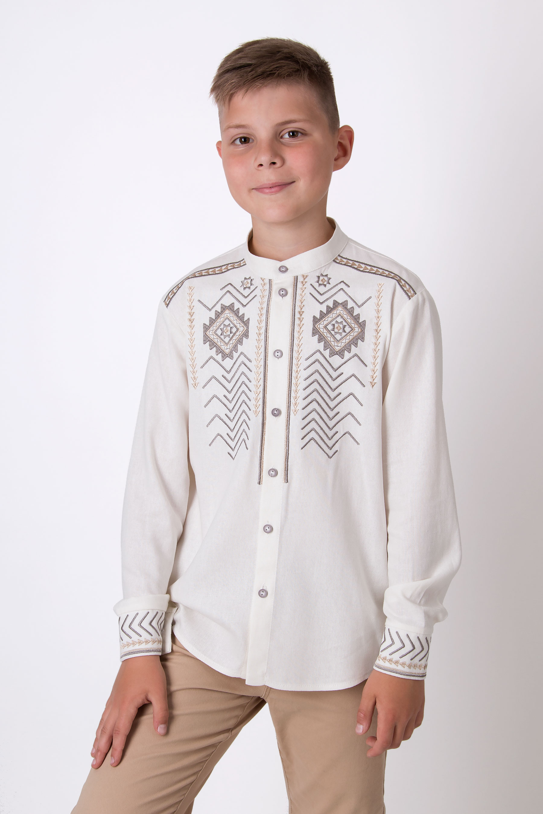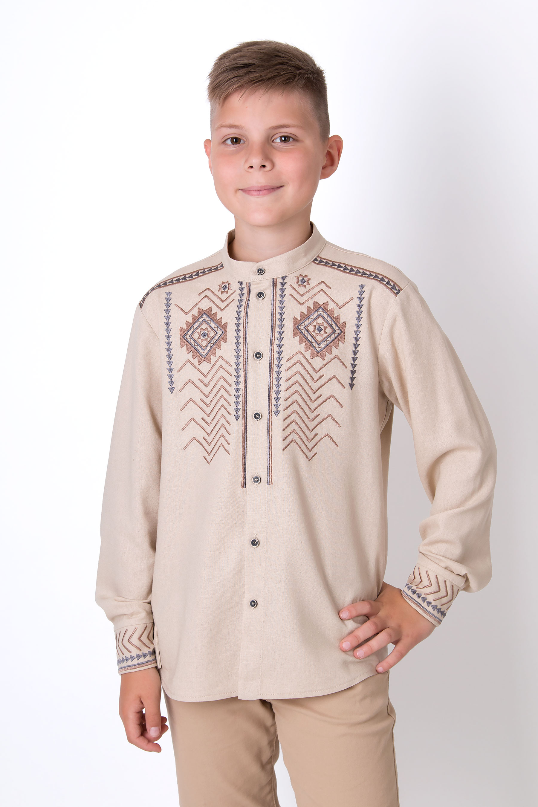 Вишиванка з льону у пастельних відтінках надає виробу сучасного й охайного вигляду. Класичний крій із застібкою на гудзики робить модель універсальною для будь-якої події.