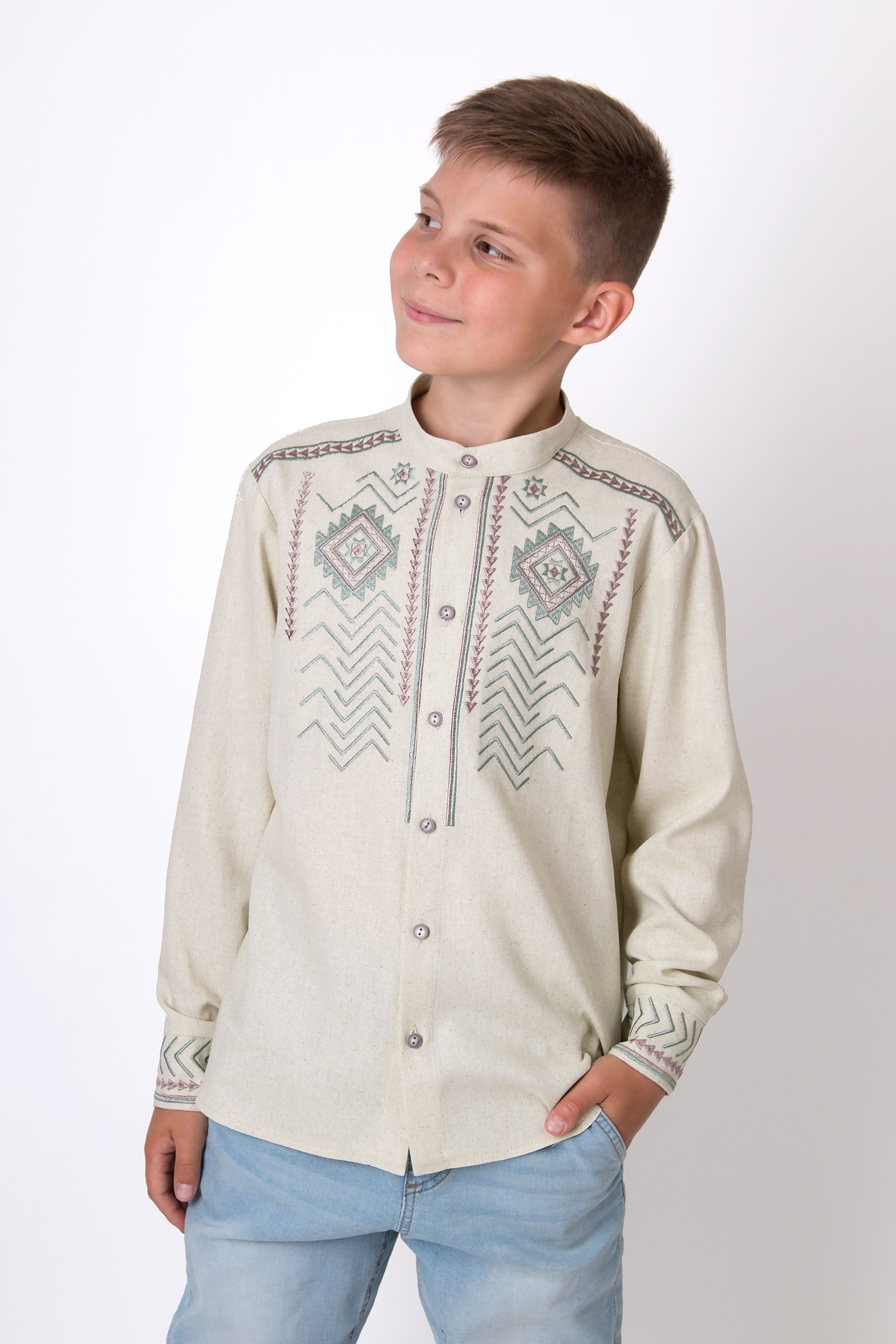Вишиванка з льону у пастельних відтінках надає виробу сучасного й охайного вигляду. Класичний крій із застібкою на гудзики робить модель універсальною для будь-якої події.