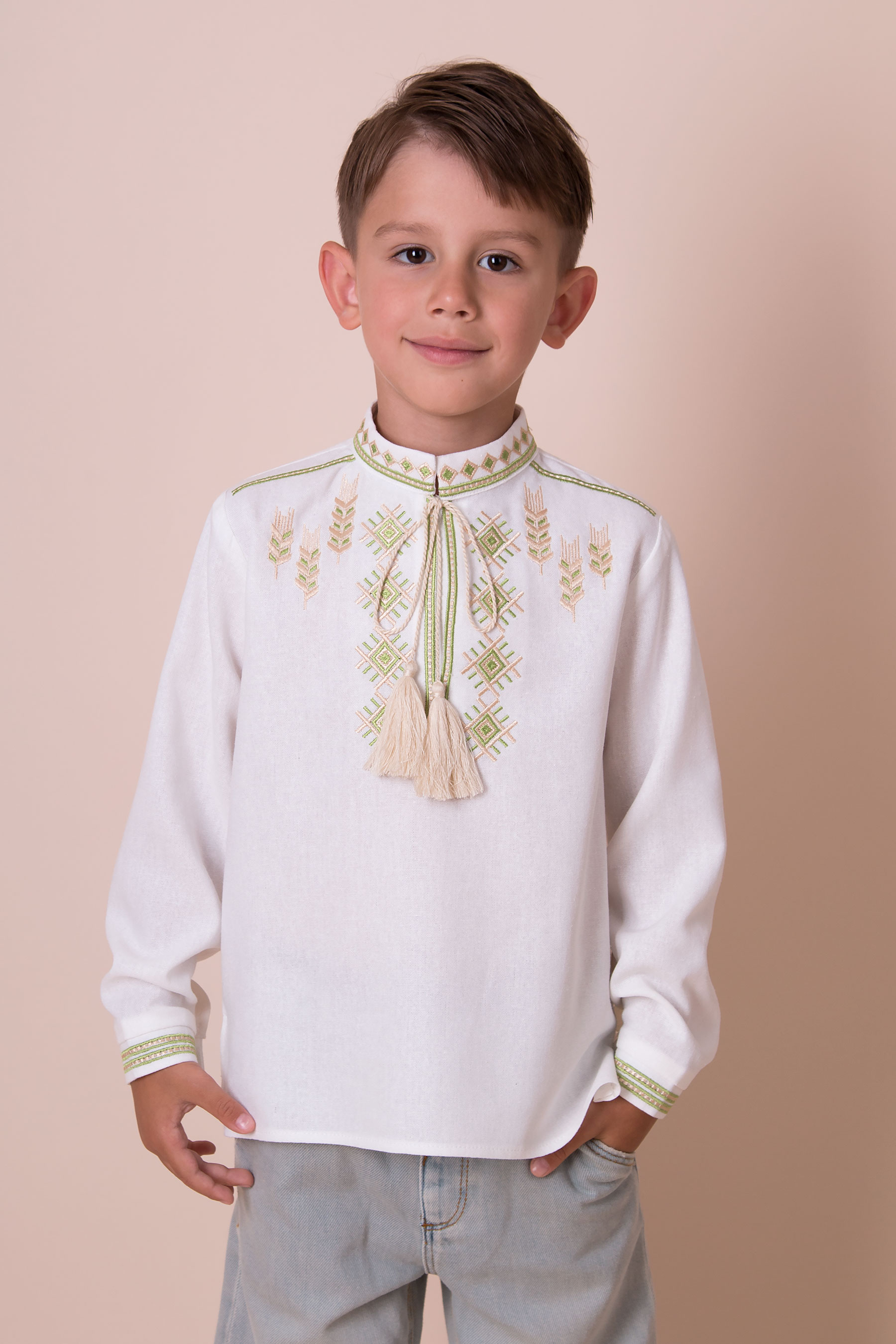 Дитяча вишиванка для хлопчика з орнаментом колосків, прямий крій, довгий рукав, комір-стійка з завʼязками-китицями.
