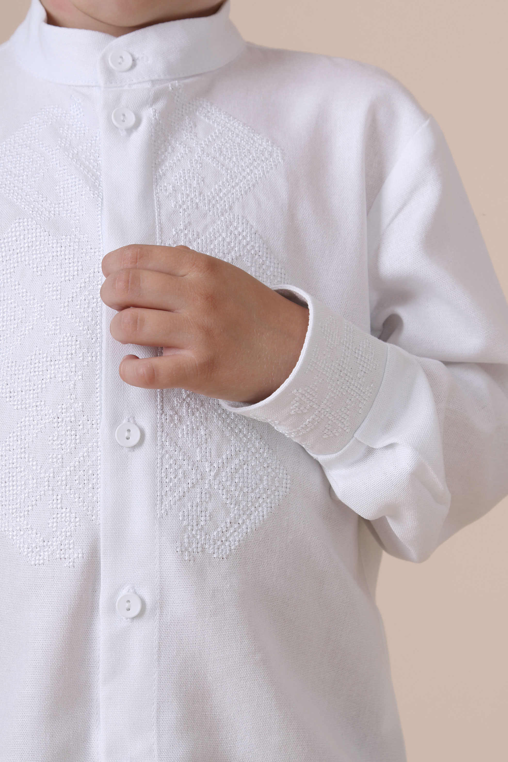 Вишиванка з вишитим геометричним орнаментом виконана білим по білому. Модель застібається на ґудзики спереду, має акуратні манжети та стриманий сучасний вигляд. Стильна класика для особливих подій і святкових образів.