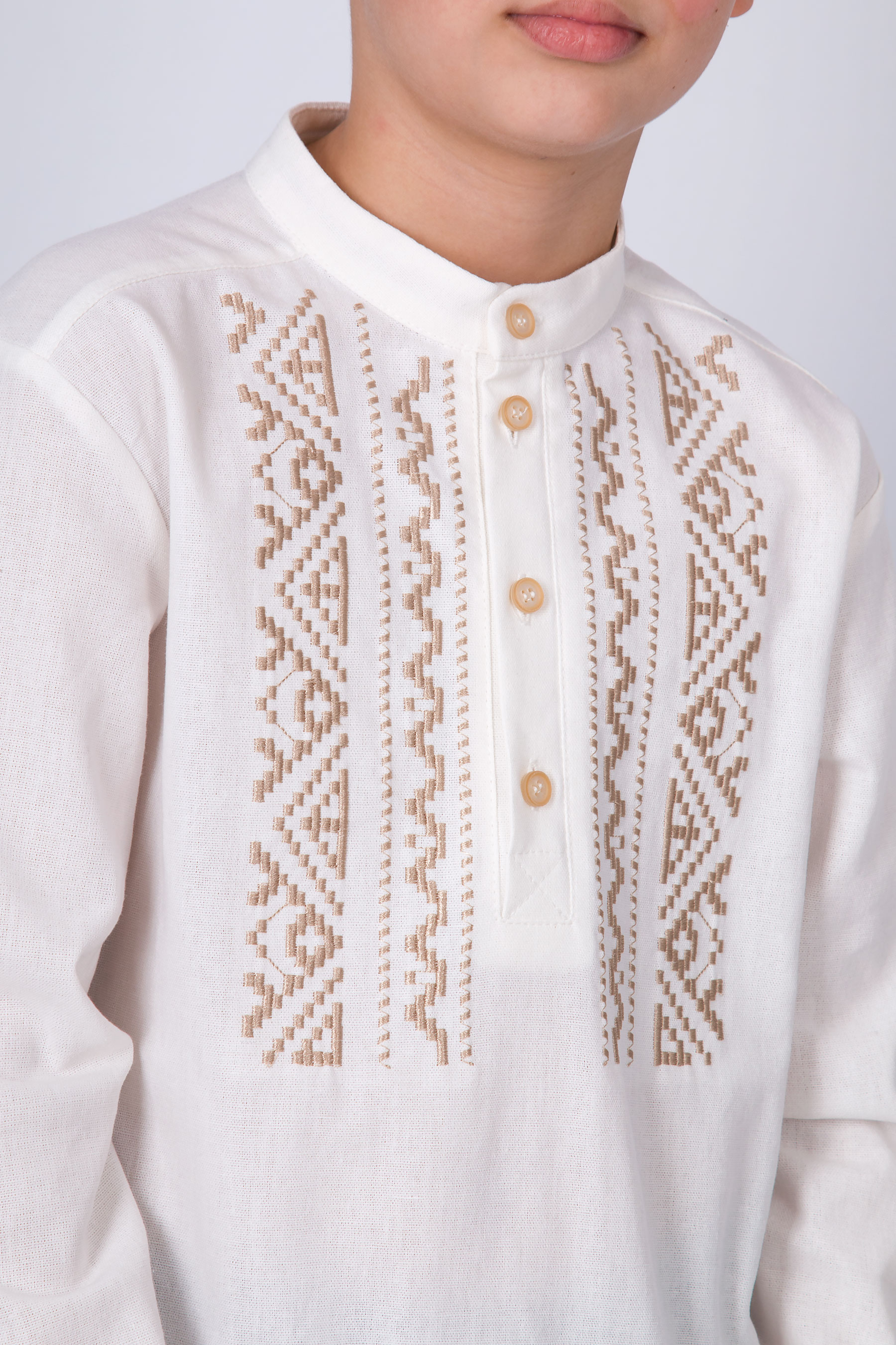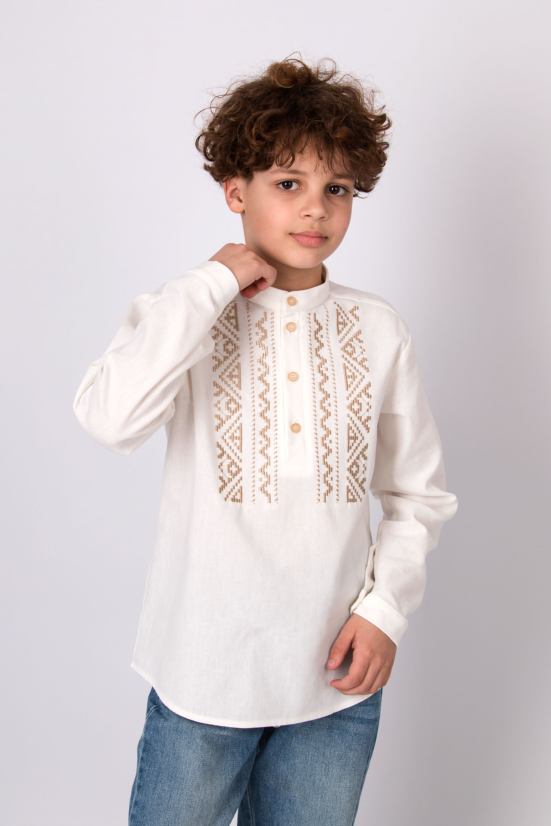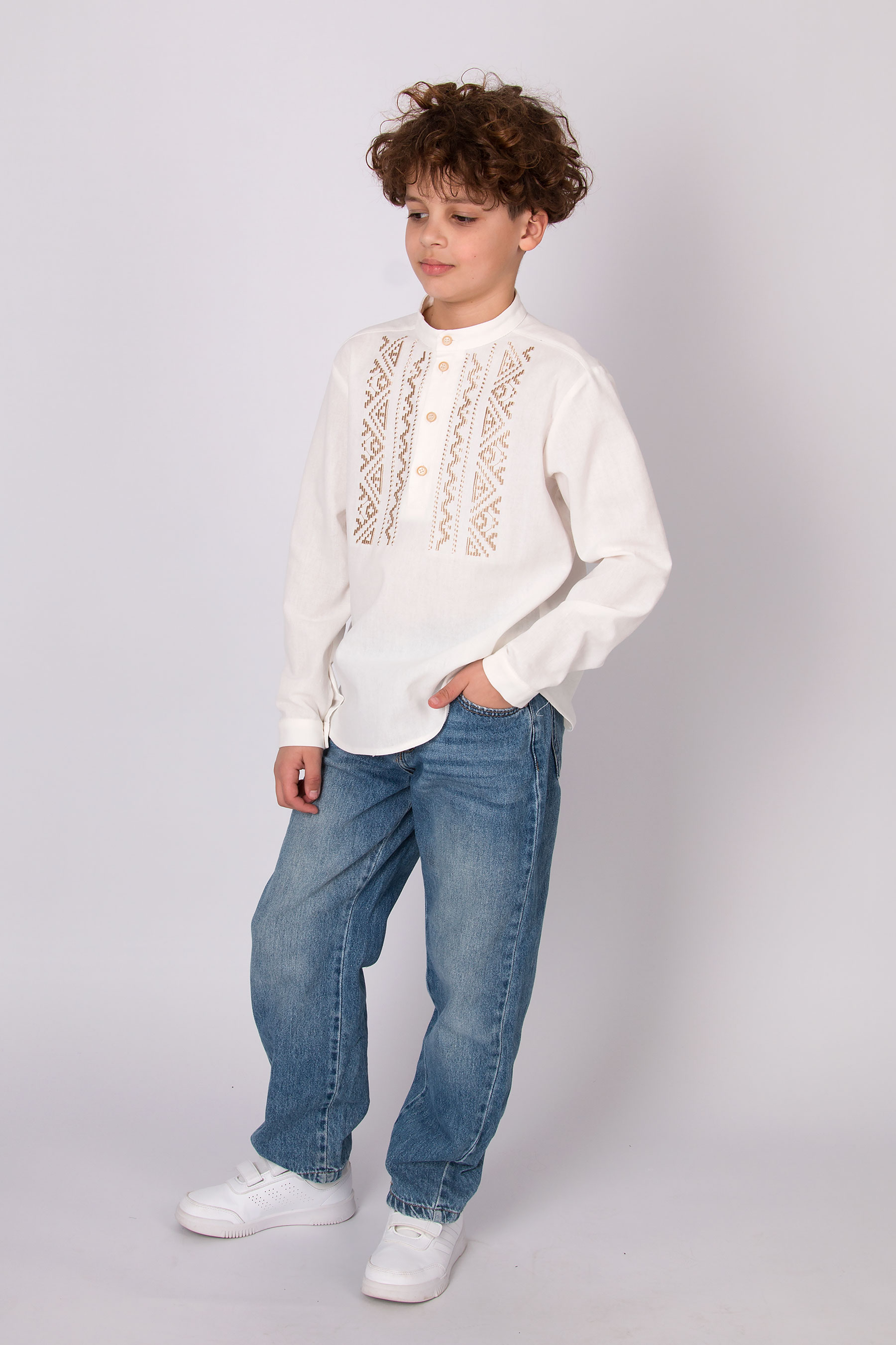 Вишиванка з прямим кроєм та довгим рукавом. Перед прикрашений орнаментом у стриманому виконанні. Застібається на ґудзики по центру. Комір-стійка. Рукави з манжетами.