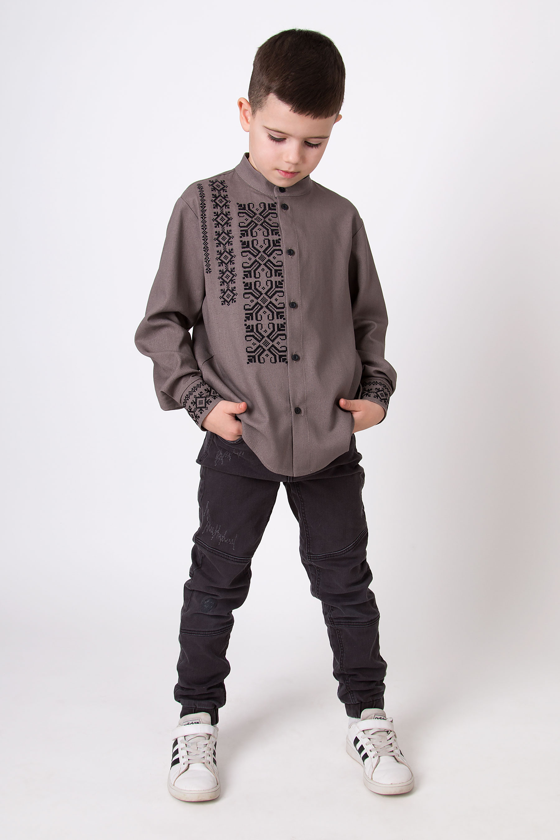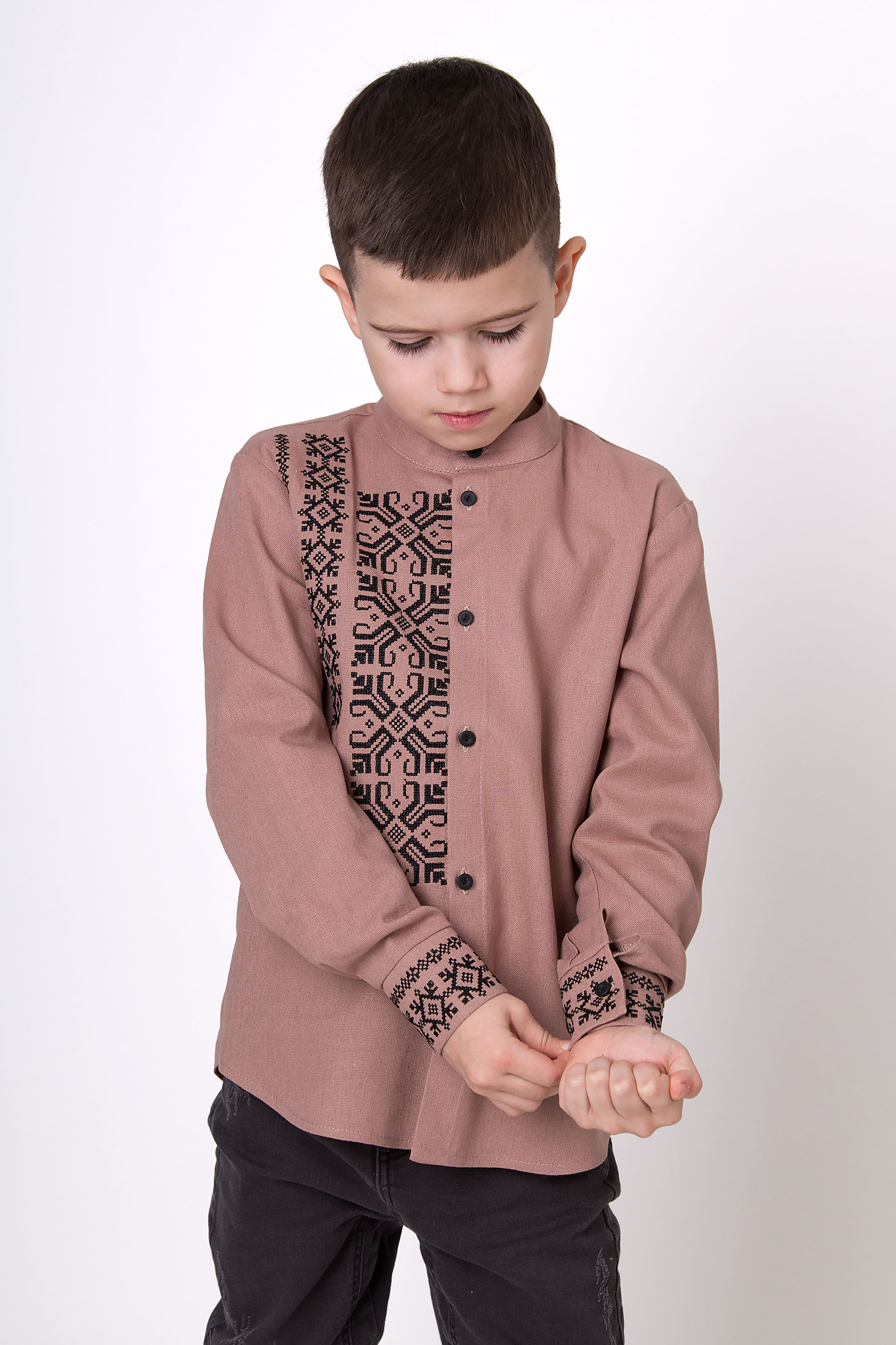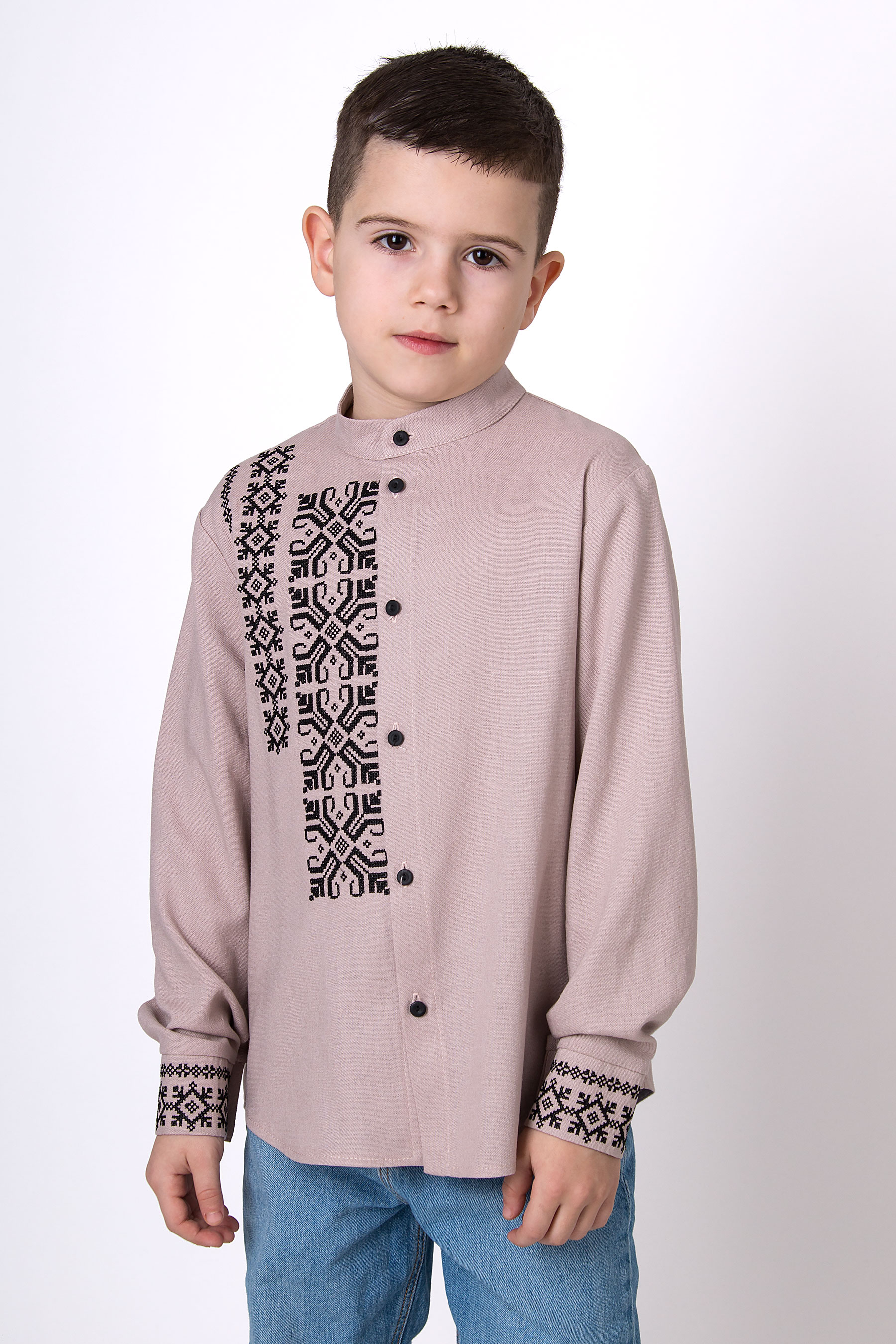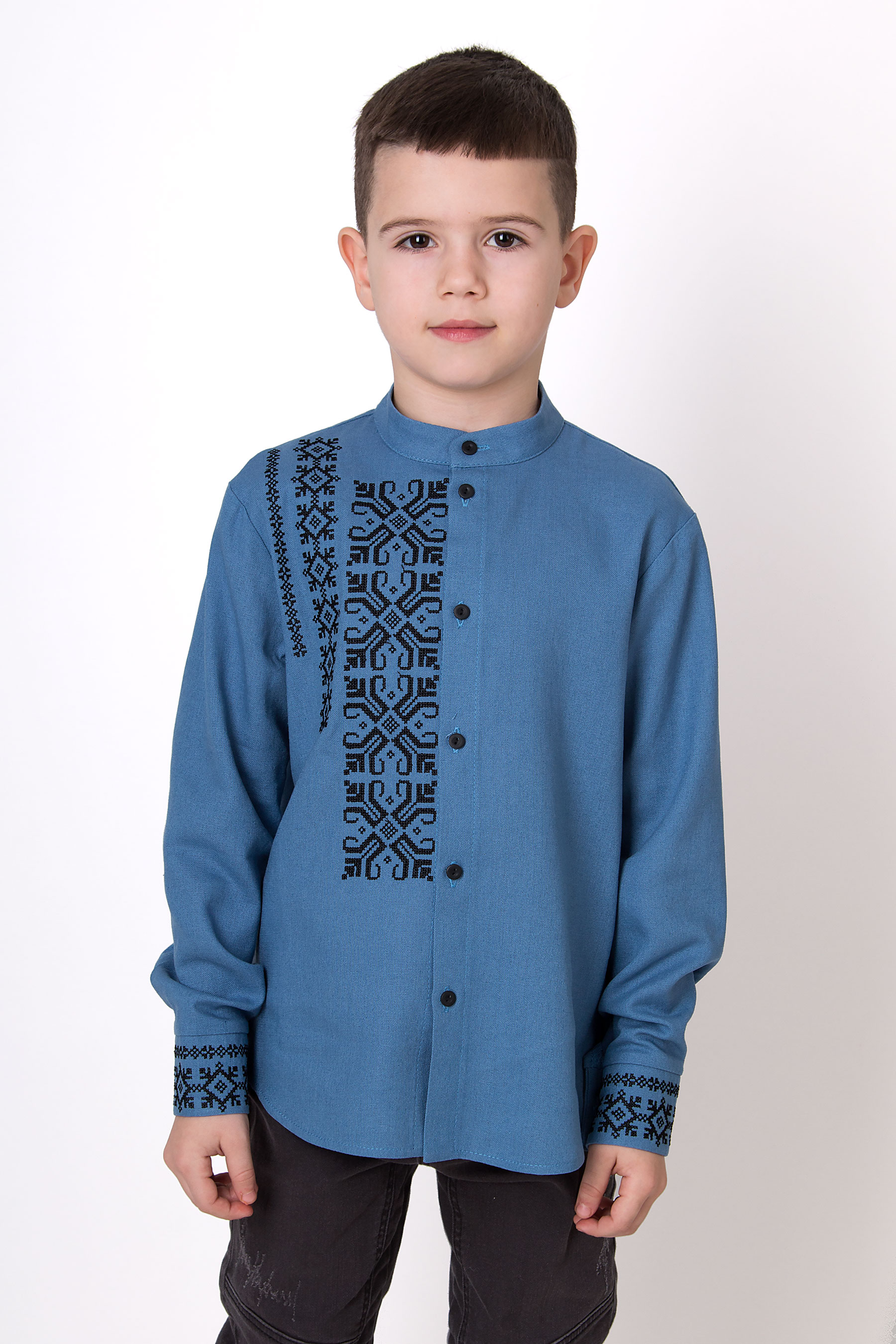 Вишиванка з льону з геометричним орнаментом, виконаним у традиційному стилі. Модель має застібку на ґудзики по всій довжині, включно з манжетами. Акуратний крій додає виробу охайності та стриманої елегантності. Такий дизайн поєднує українські традиції з сучасним стилем.