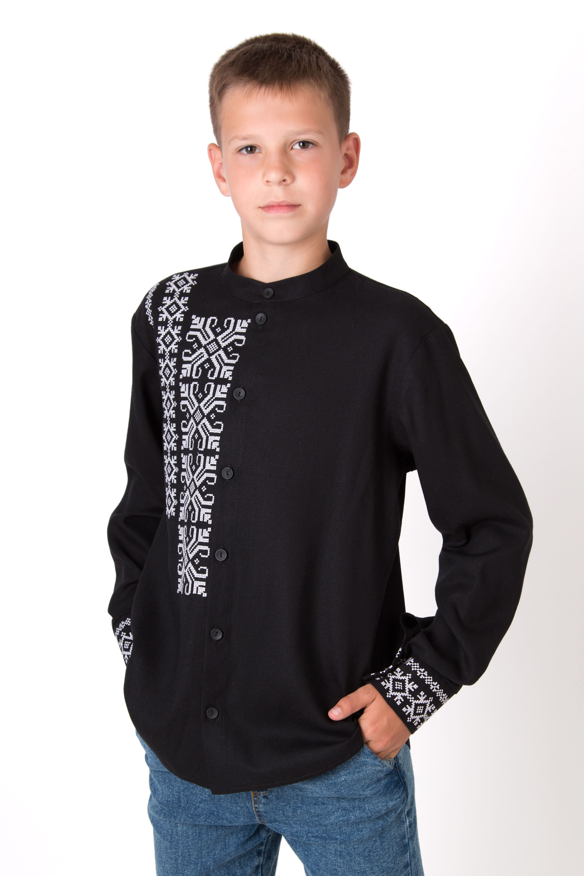 Вишиванка з льону з геометричним орнаментом, виконаним у традиційному стилі. Модель має застібку на ґудзики по всій довжині, включно з манжетами. Акуратний крій додає виробу охайності та стриманої елегантності. Такий дизайн поєднує українські традиції з сучасним стилем.
