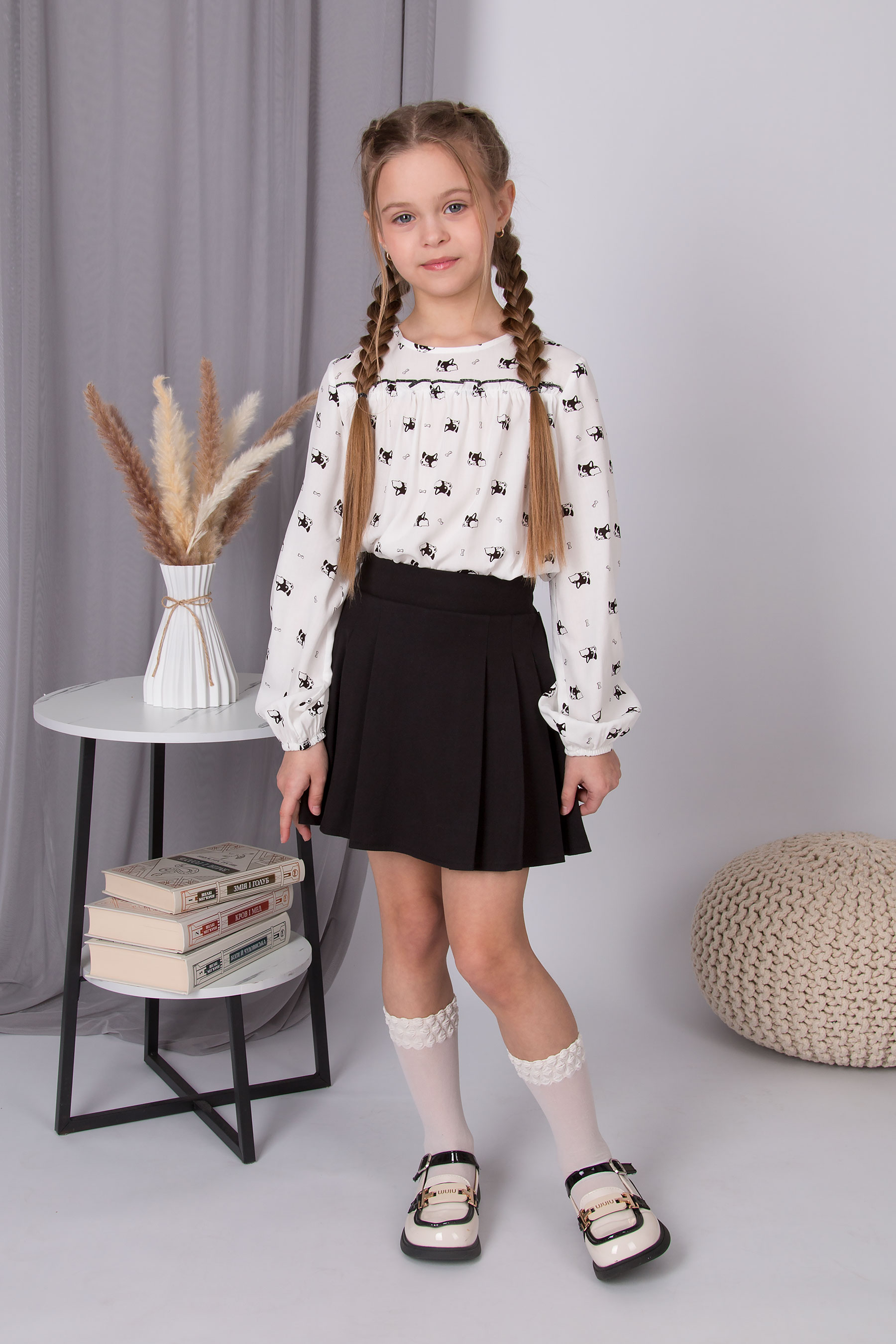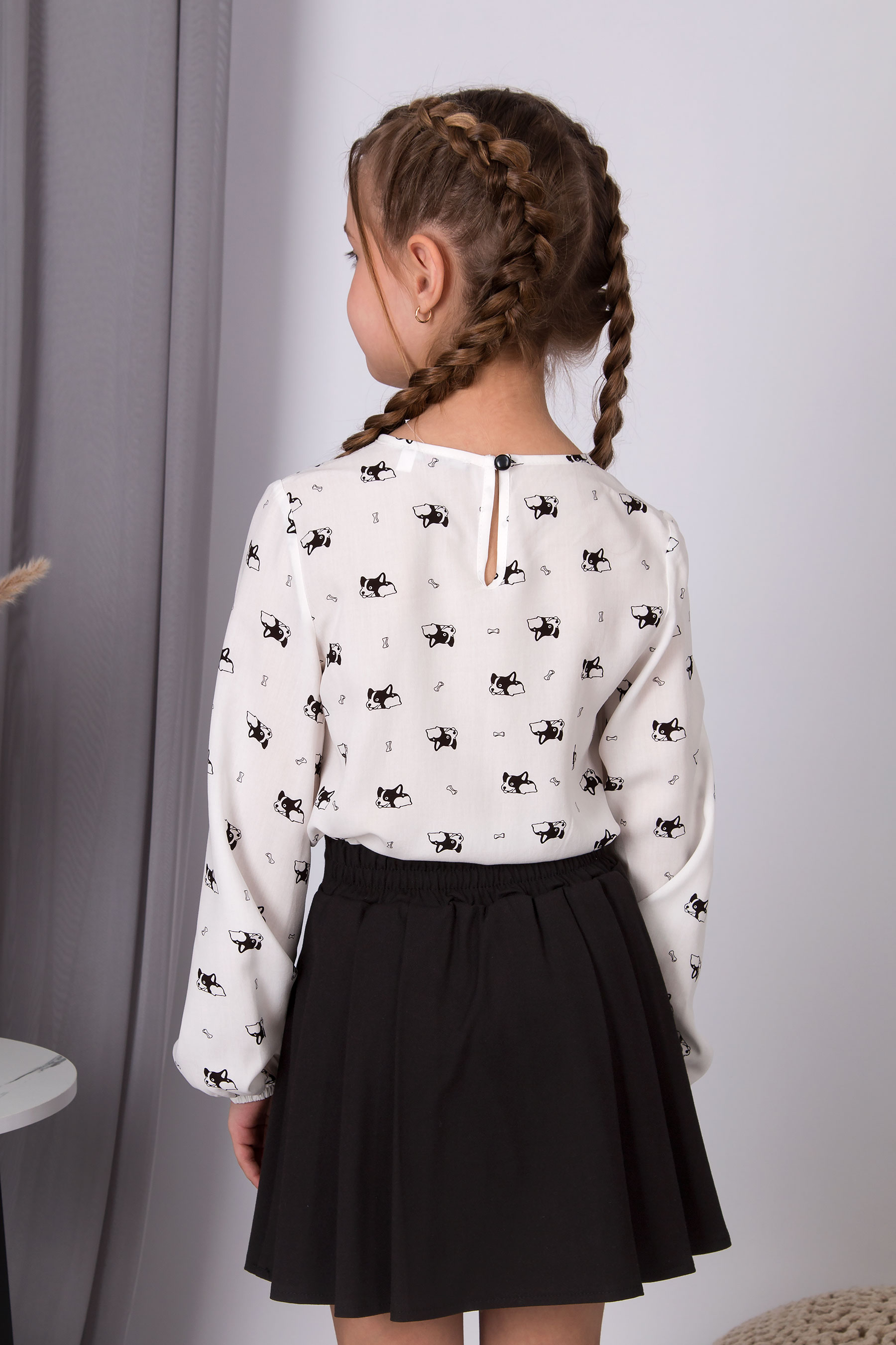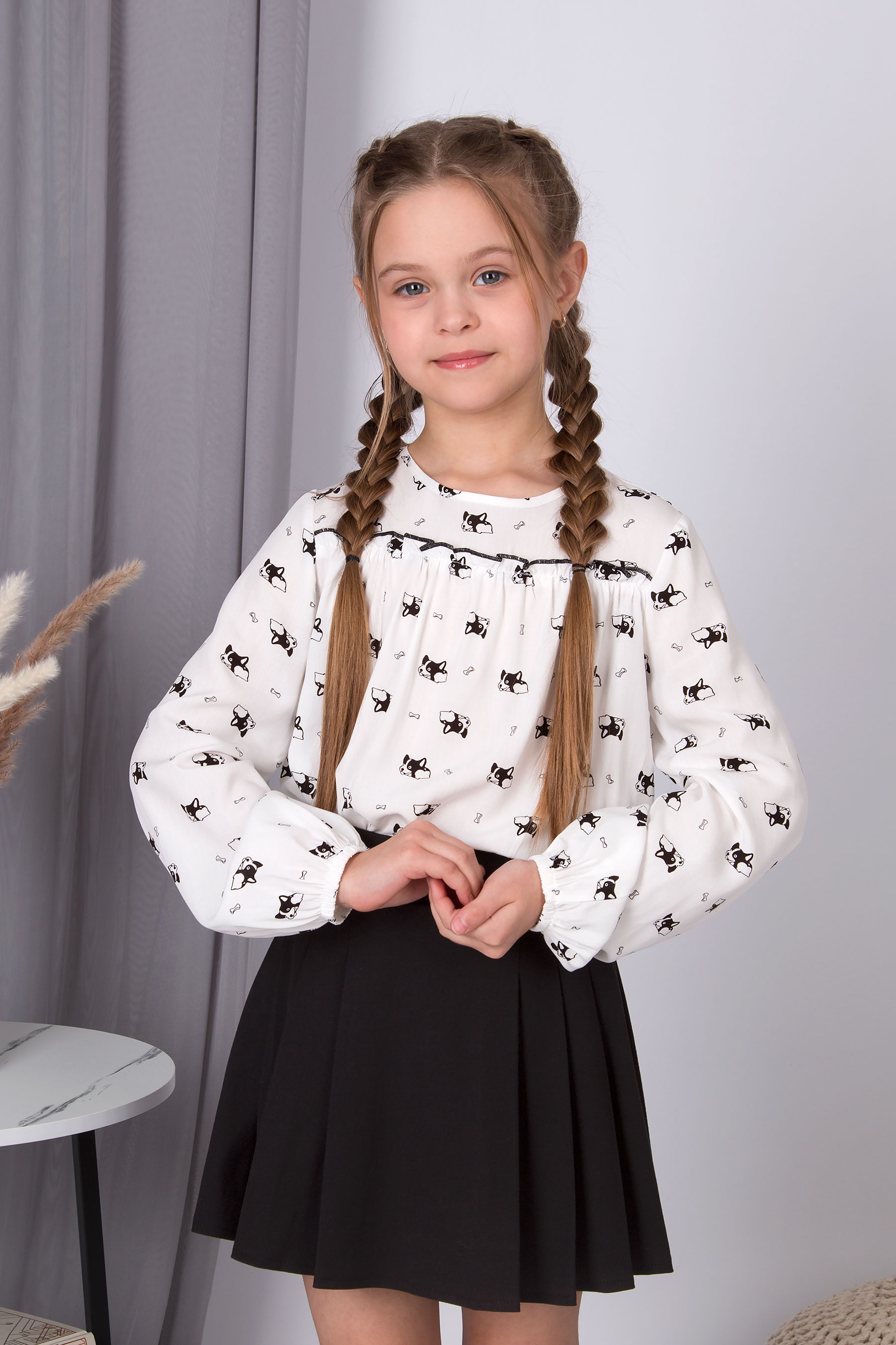 Блуза зі штапелю з принтом собачок. Вільний крій, кругла горловина, довгий рукав на м’якій резинці.