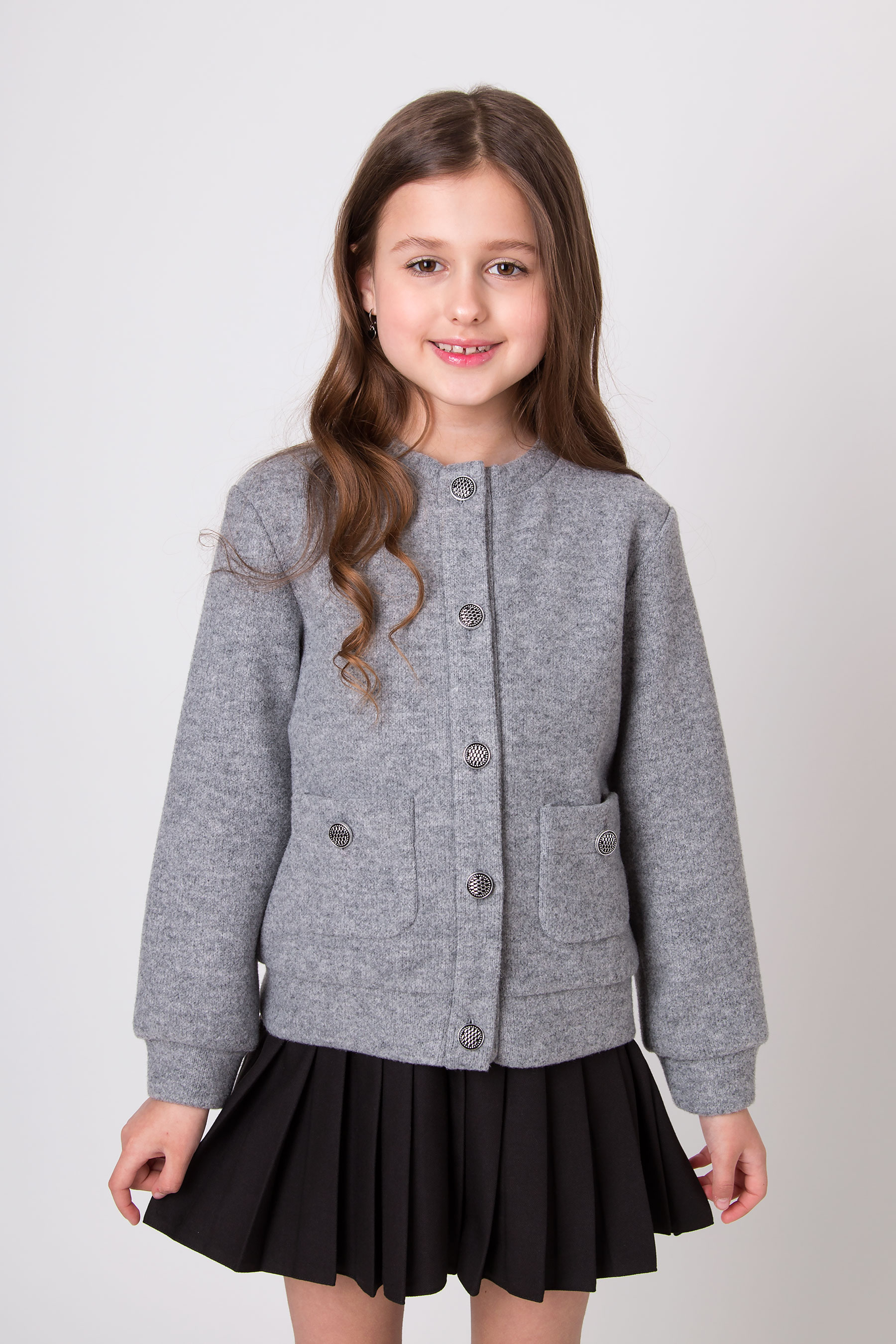 Стильна кофта для дівчинки з м’якої ангори поєднує комфорт і акуратний класичний вигляд. Модель має прямий крій, застібається на ґудзики та доповнена зручними накладними кишенями. Ідеально підходить для школи та щоденних образів.