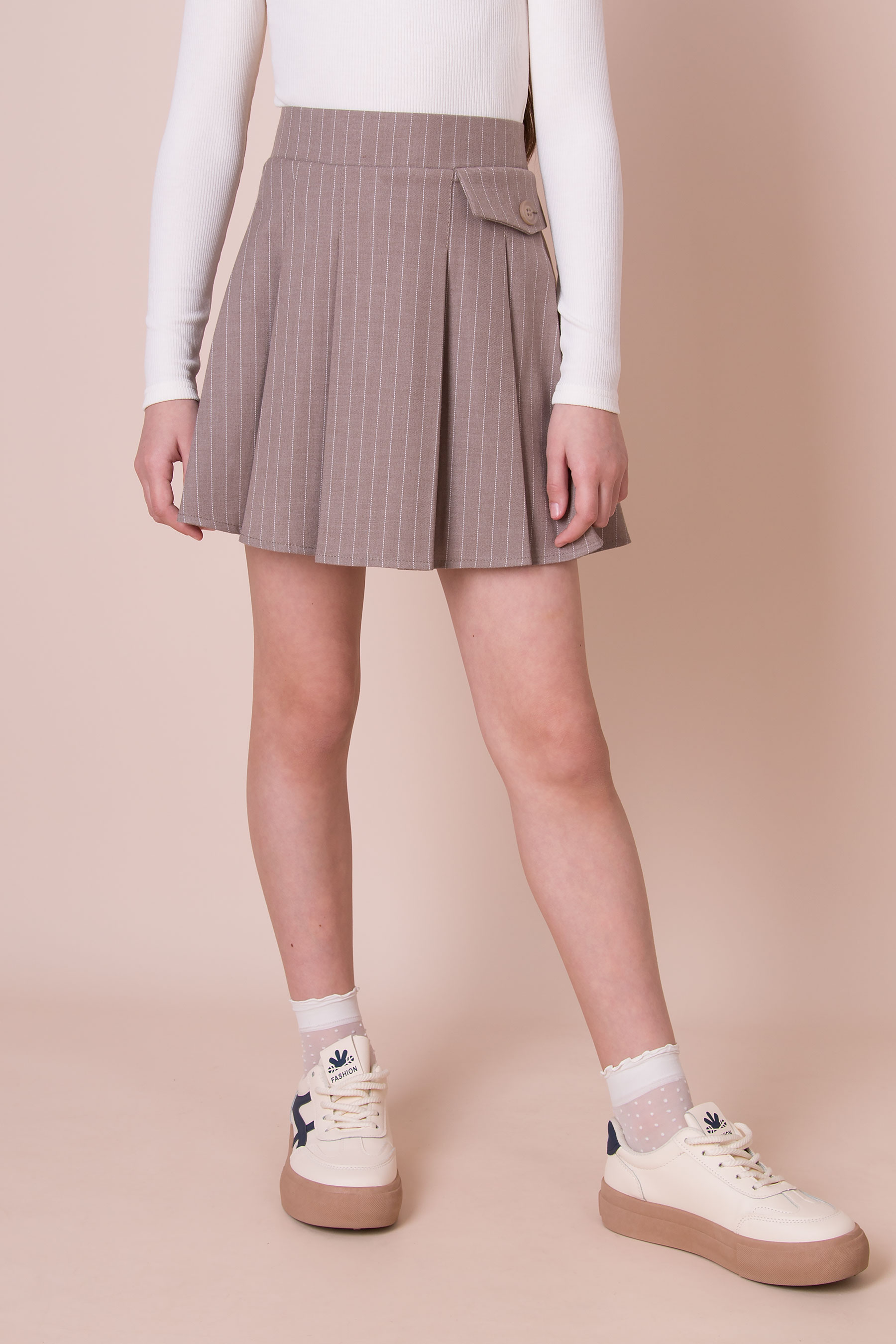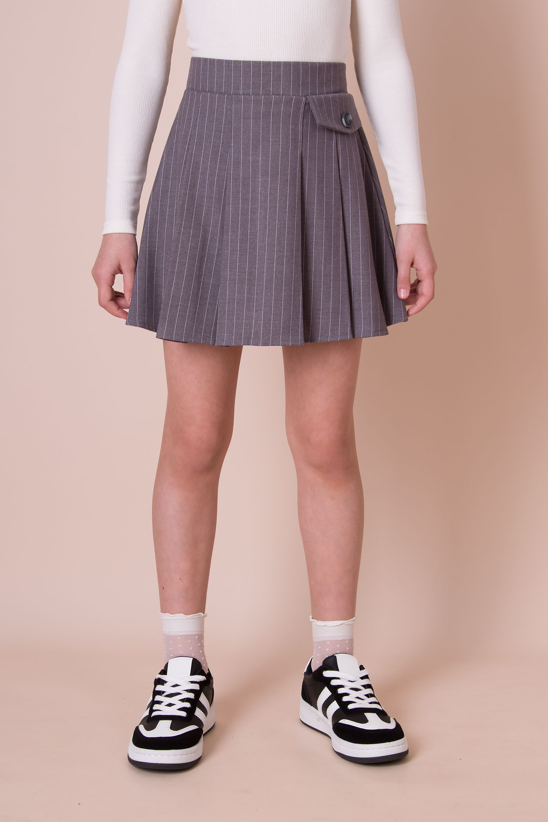Спідниця з пришивним поясом та односторонніми складками. Модель має бокову застібку-блискавку, довжина виробу — вище коліна.