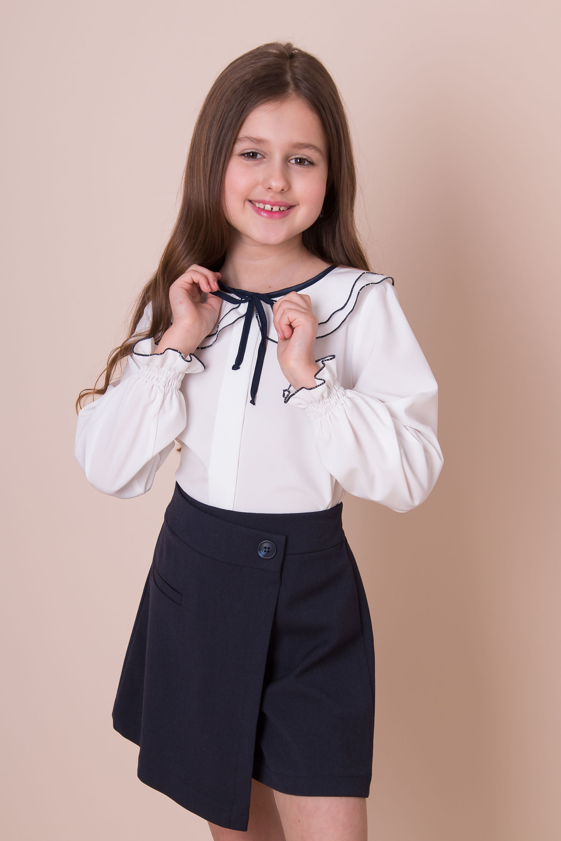 Модель спідниця-шорти з декоративним запахом спереду. Оснащена пришивним поясом, застібкою на ґудзик.