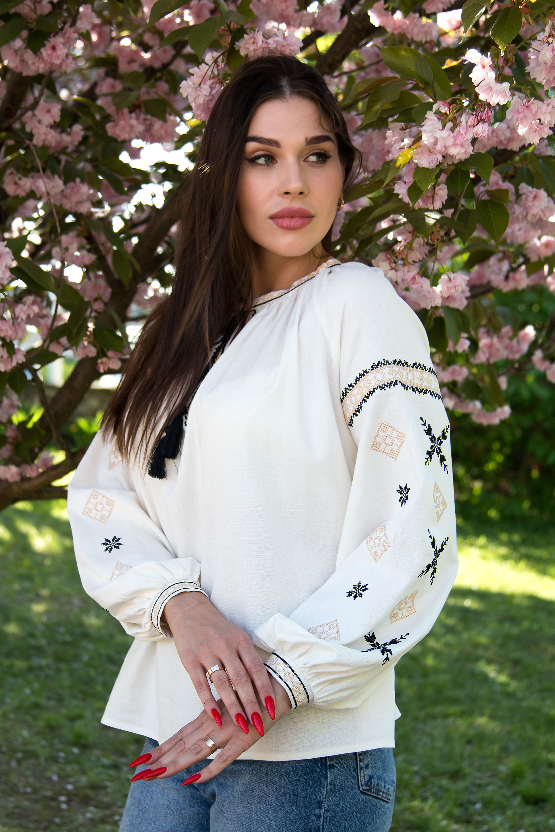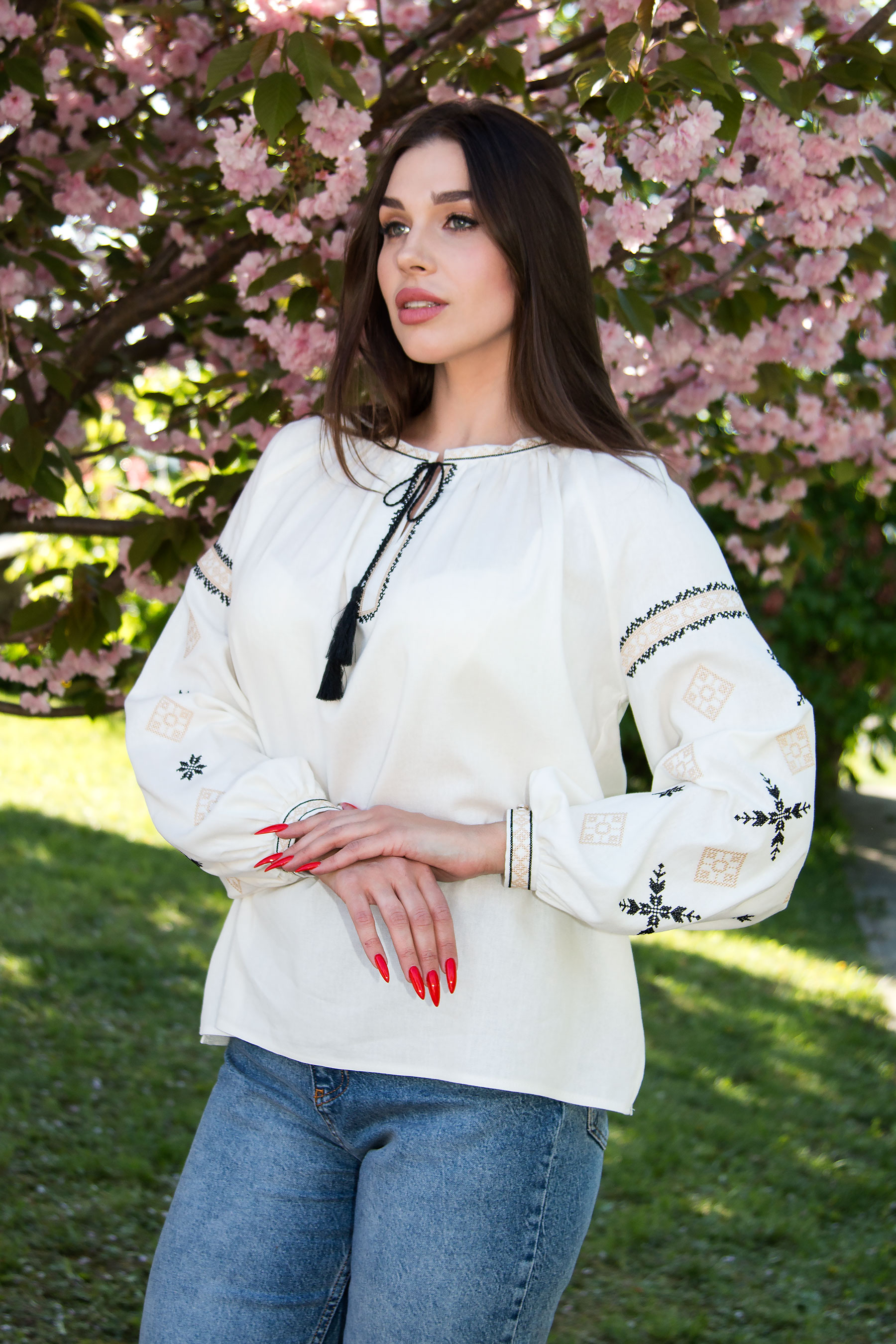 Вишиванка з льону вільного крою. Рукави з вишивкою та застібкою на гудзики. На горловині зав’язки з китицями, що додають виробу виразності. Стильна модель, яка поєднує традиції та сучасний дизайн. Ідеальний вибір для тих, хто цінує якість і український стиль.