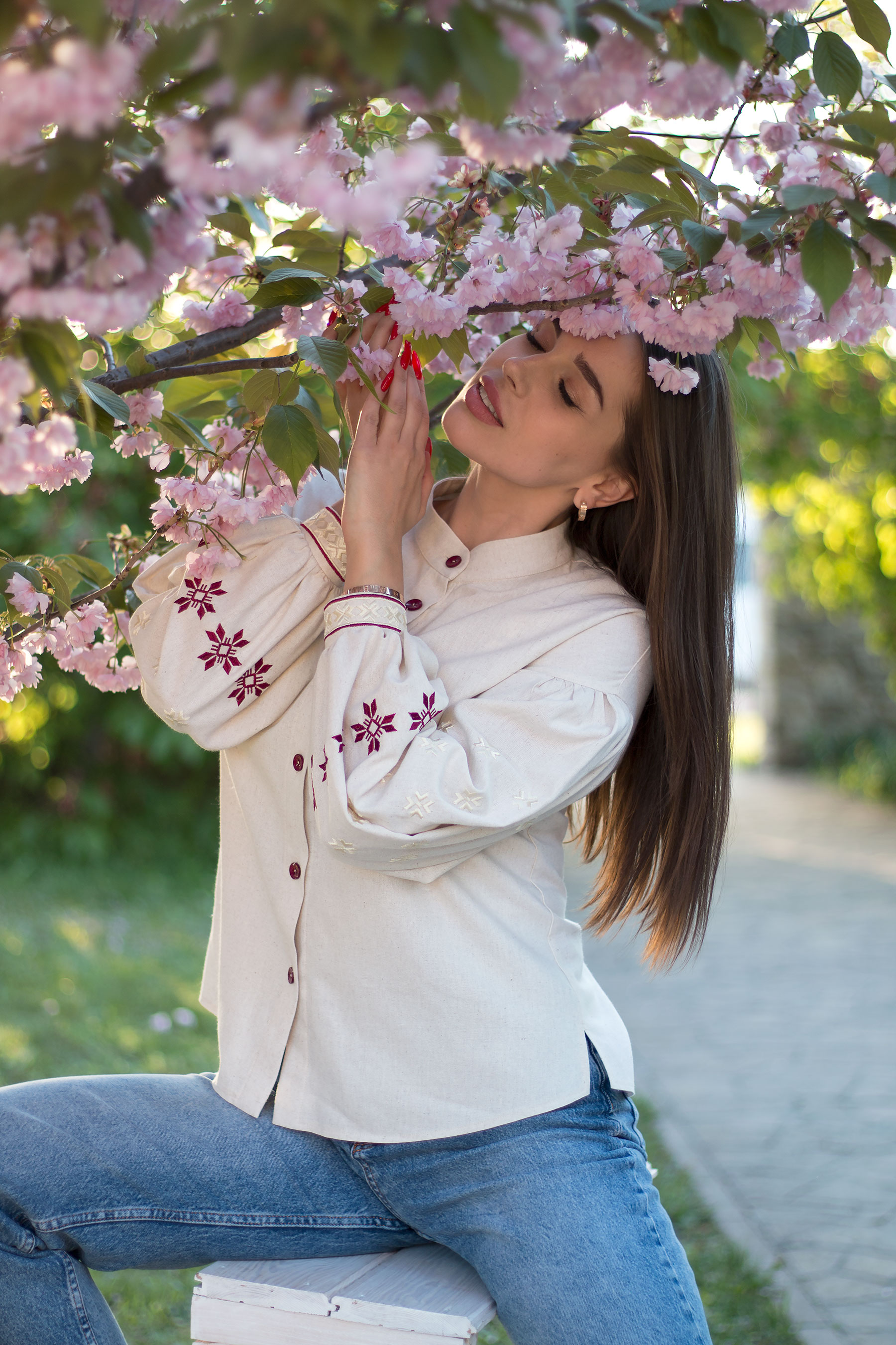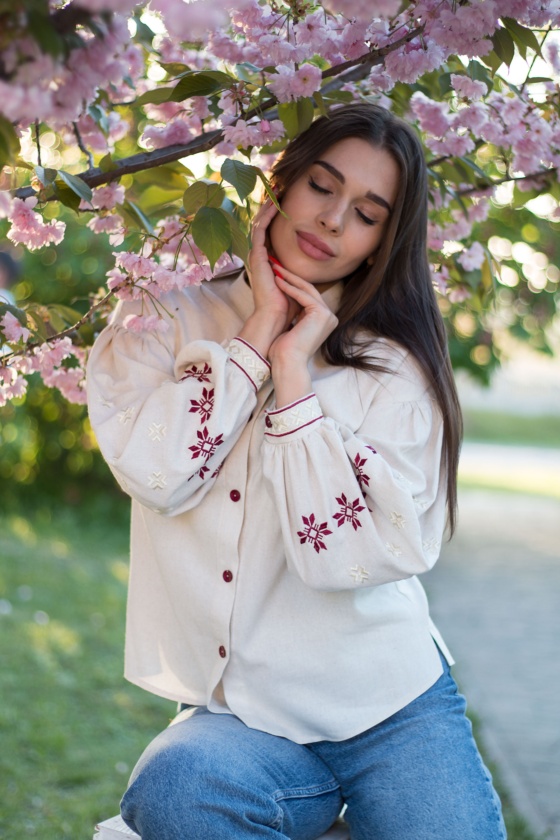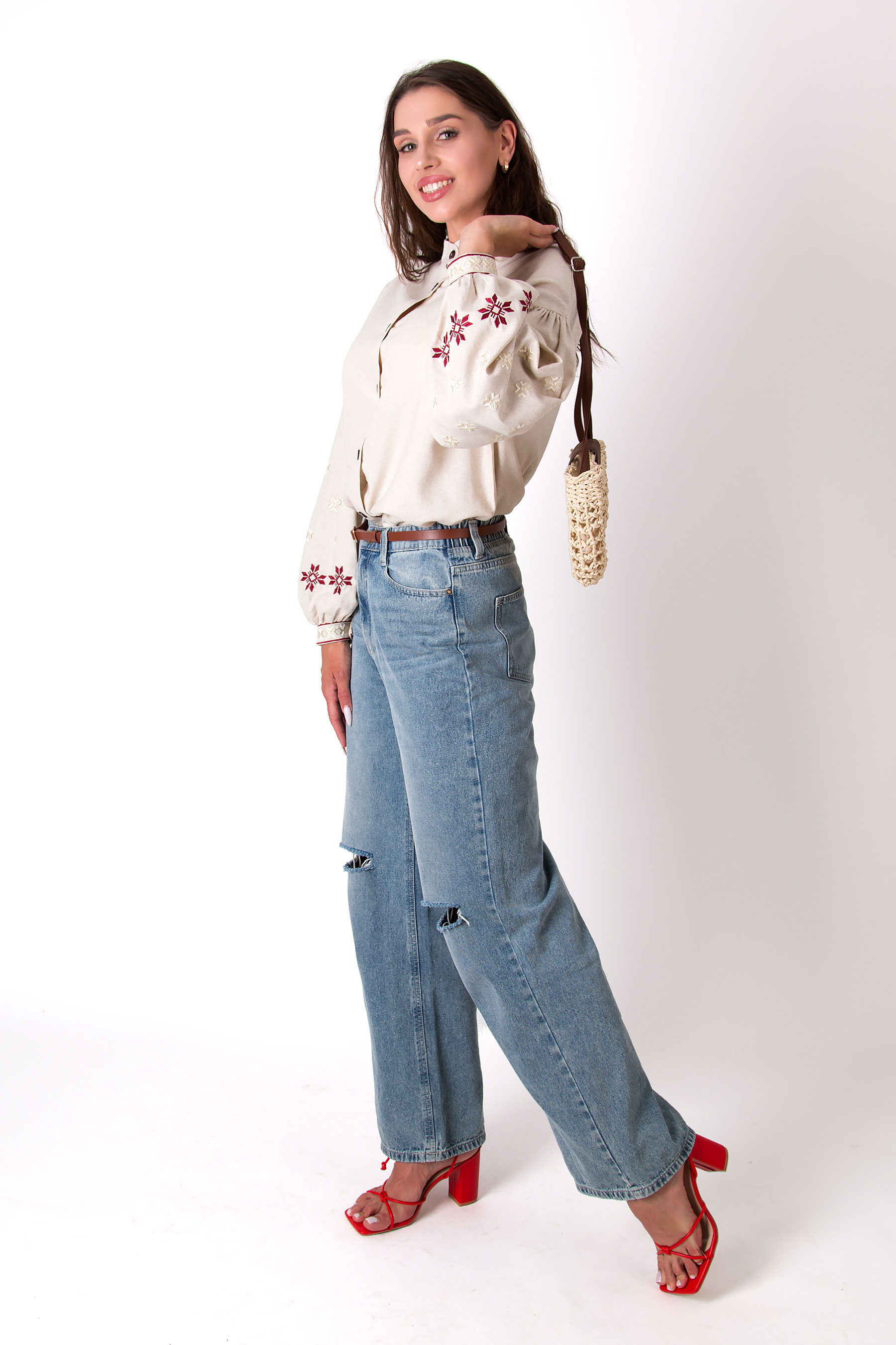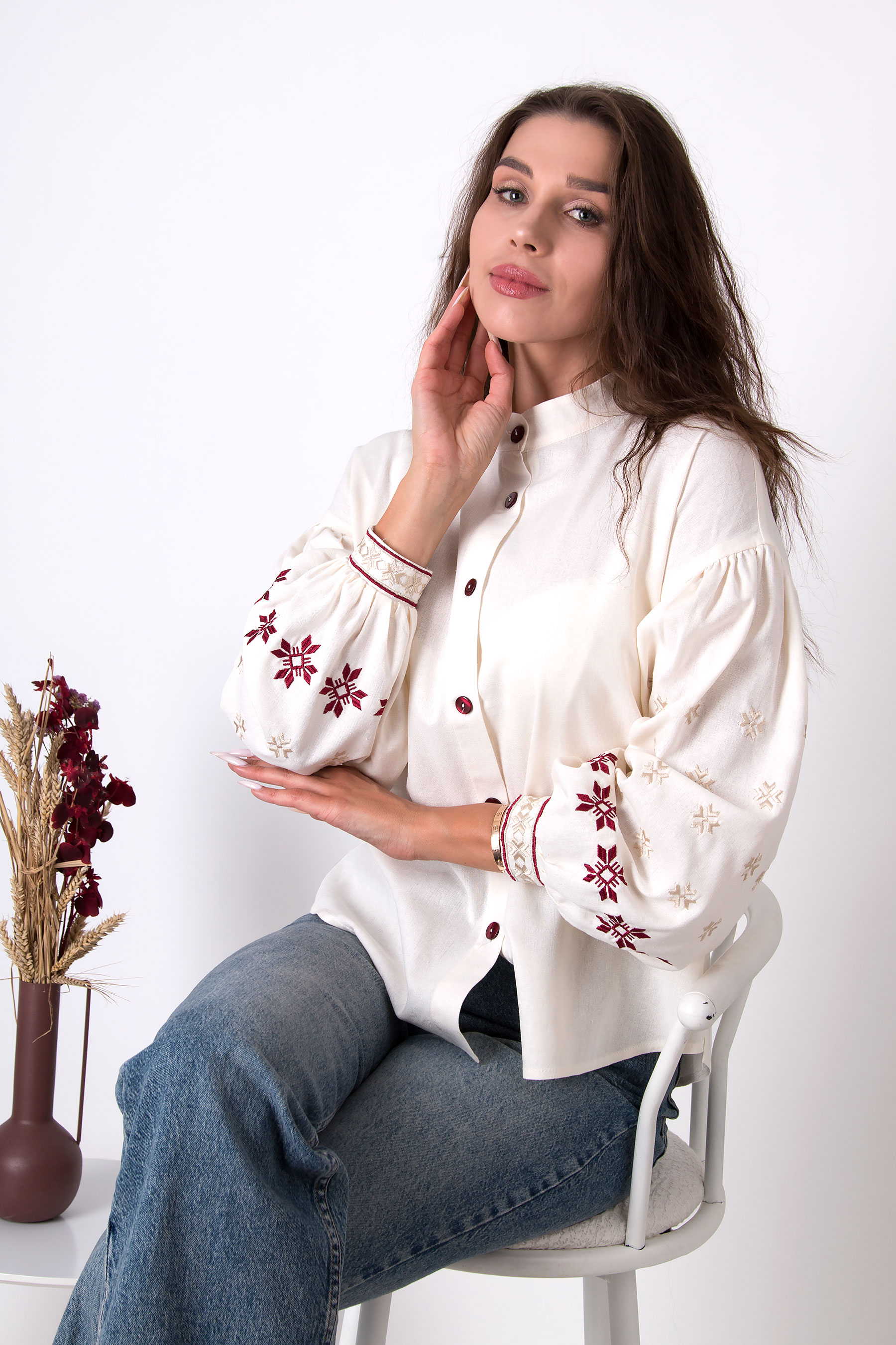 Вишиванка з льону з вільним силуетом і об’ємними рукавами. Прикрашена вишивкою з традиційними мотивами, що додають виробу характеру й глибини. Має застібку на ґудзики та виглядає гармонійно як у поєднанні з джинсами, так і зі спідницею чи класичними штанами.