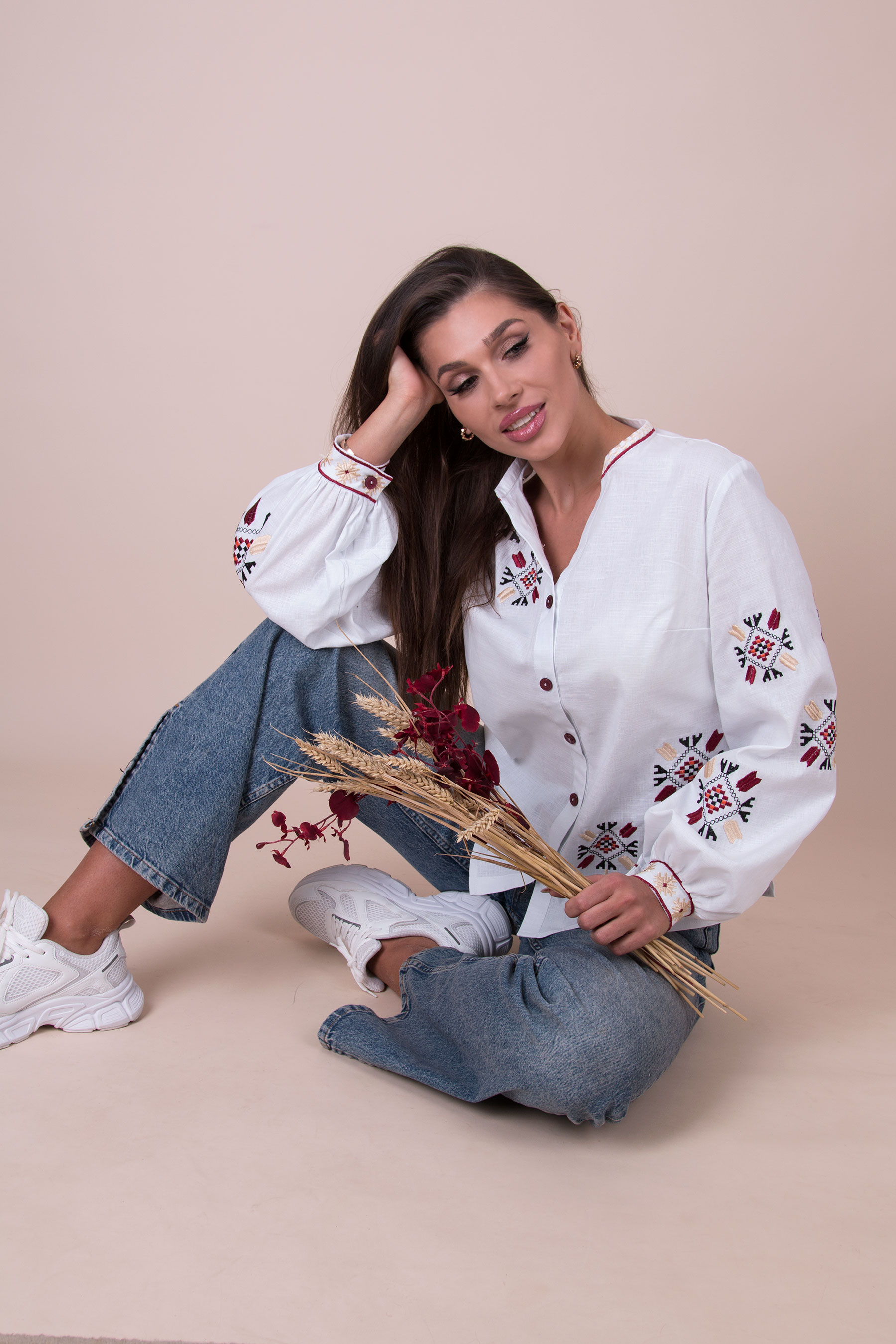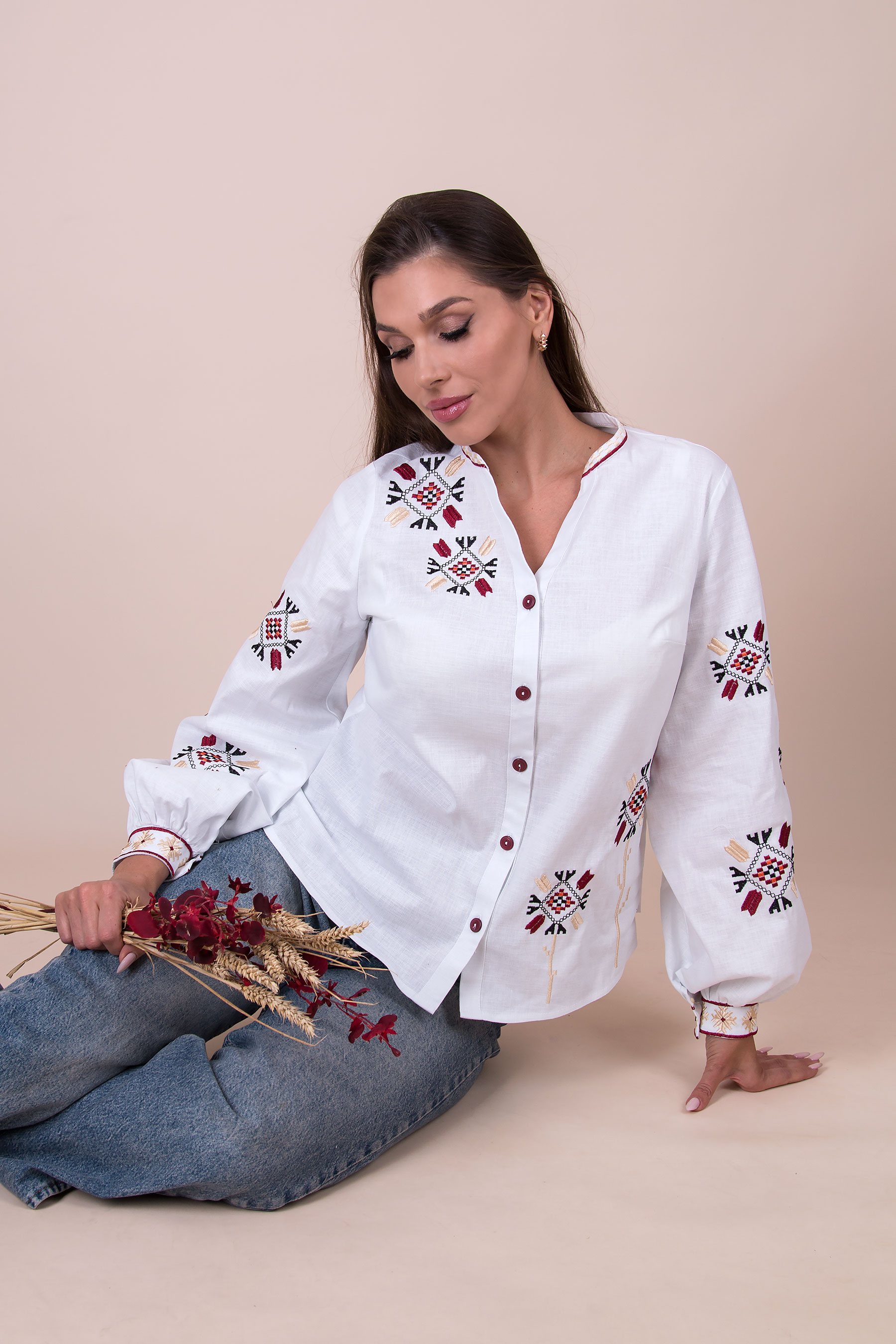 Жіноча вишиванка з традиційними українськими орнаментами. Модель прямого силуету з V-подібним вирізом, застібається на ґудзики. Довгі рукави зібрані на манжети та оздоблені вишивкою. Орнамент розміщений на грудях і рукавах. Льон стрейч легкий, дихаючий, приємний до тіла.